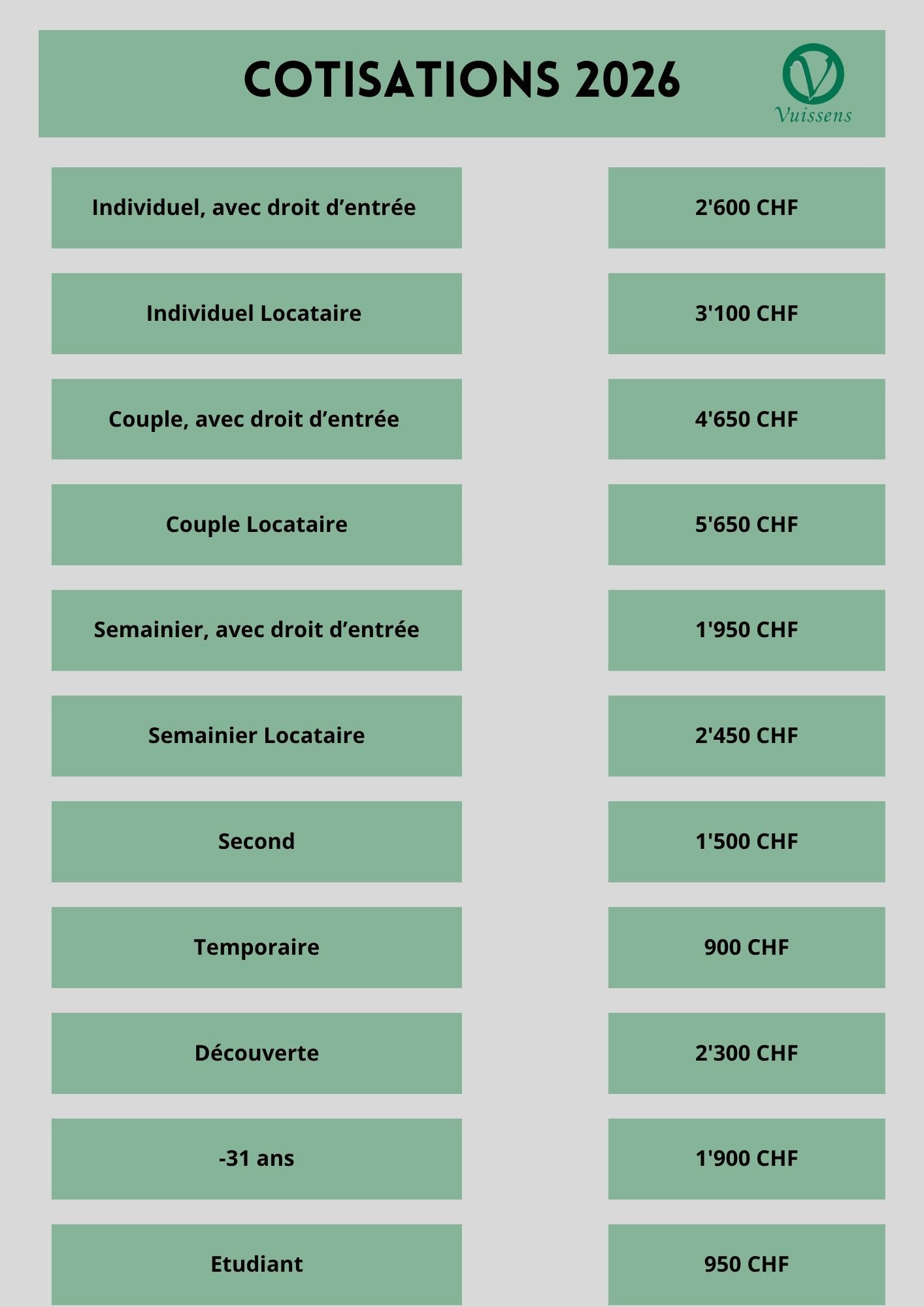 Toutes nos offres sont soumises à conditions.Pour plus de renseignements, nous vous invitons à consulter la brochure "devenir Membre à Vuissens" ou bien à nous contacter par email ou par téléphone, ou à venir sur place ! Nous serions ravis de vous faire découvrir les lieux et de répondre à toutes vos questions.