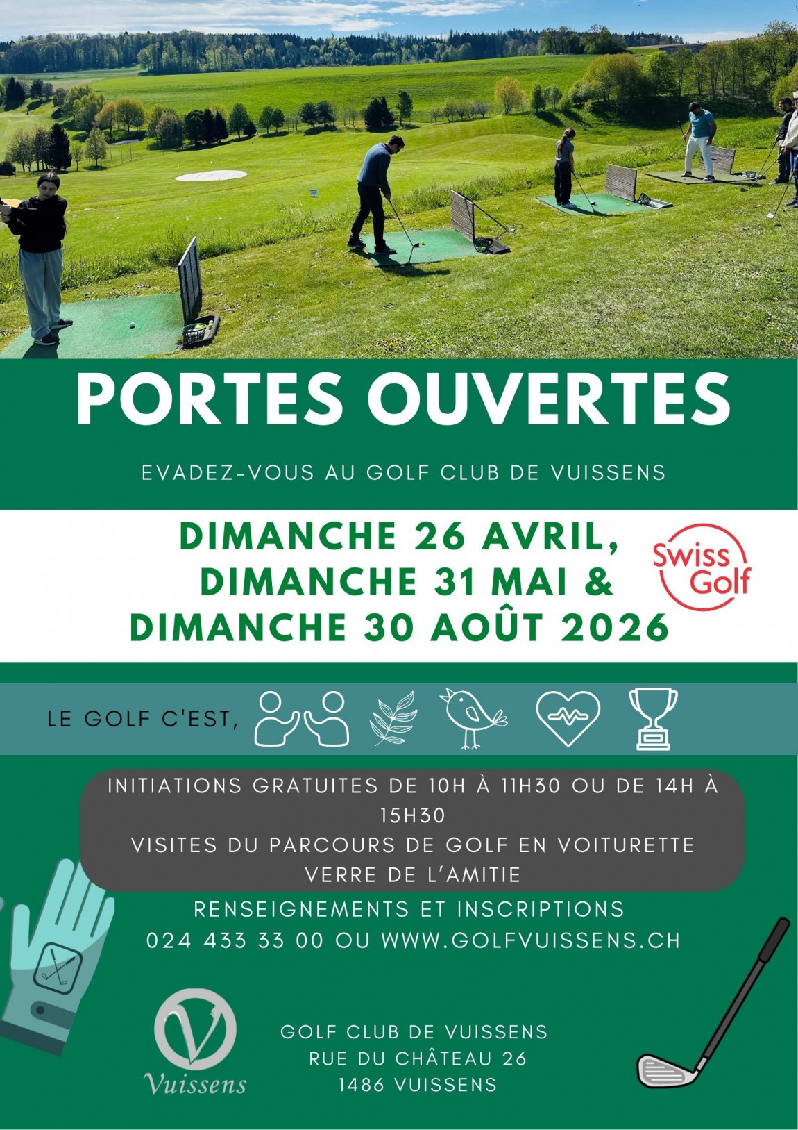 Golf Club Vuissens hosts a few times a year its "open doors" so people can discover the game of golf and its environment. In 2026, the open doors are happening on Sunday 26th of April, Sunday 31st of May and Sunday 30th of August.